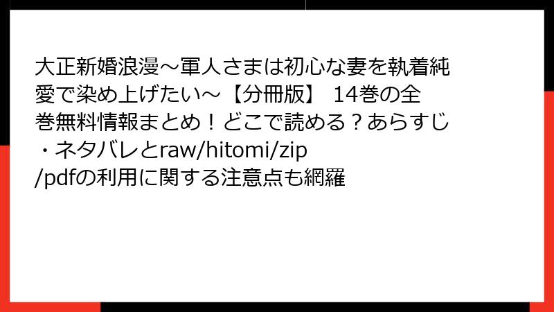 『大正新婚浪漫~軍人さまは初心な妻を執着純愛で染め上げたい~【分冊版】14巻』をraw、hitomi、zip、pdf、漫画バンクなどの海賊版サイトで読むことは、法的リスク、マルウェア感染、業界への悪影響、低品質な体験など、多くの危険を伴います。楓と雪禎の心揺さぶる純愛を心から楽しむなら、正規ルートを選ぶのが賢明です。作品を支え、作者に感謝を伝えるためにも、ぜひ公式で購入を。あなたの一冊が、大正ロマンスの未来を照らします! コメントで、好きなシーンや正規版の感想をぜひシェアしてくださいね!