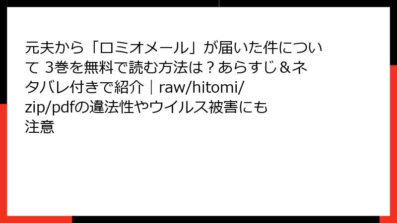 こんにちは、漫画を愛するブロガーです! 今回取り上げるのは、「元夫から『ロミオメール』が届いた件について」のような人気漫画を、raw、hitomi、zip、pdf、漫画バンクなどの海賊版サイトで読むことのリスクについて。この作品は、復讐と恋愛が織り交ざった魅力的なストーリーで、つい無料で読みたくなる気持ちもわかります。でも、海賊版サイトの利用には重大な危険が潜んでいます。この記事では、法的、技術的、倫理的な観点から、そのリスクを詳しく解説。ブログ形式で、わかりやすく、読み応えのある内容にまとめました。さっそく、具体的な危険性を