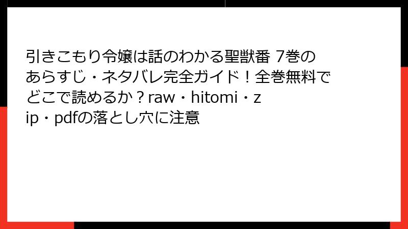 こんにちは、漫画愛好家の皆さん! 人気ファンタジー・ラブコメ「引きこもり令嬢は話のわかる聖獣番」を、raw、hitomi、zip、pdf、漫画バンクなどの海賊版サイトで読もうかと考えるのは、ついつい無料の誘惑に負けちゃう気持ち、わかります。でも、2025年現在、これらのサイトはただの「便利な宝庫」じゃありません。法的・セキュリティ・経済的な地雷原です。このブログでは、そんな海賊版サイトのリスクを、具体例を交えながら詳しく解説。ミュリエルと聖獣たちの心温まる物語を、安全に楽しむための警告としてお届けします。ネタバレなしで読み進めつつ、読み応えを重視して構造化しました。海賊版は絶対NG! 正規ルートで作者を応援しましょう♪