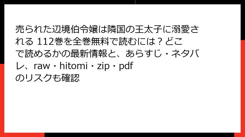 raw、hitomi、zip、pdf、漫画バンクなどの海賊版サイトは、法的罰則、ウイルス感染、個人情報漏洩、経済損失、倫理的後悔の5大リスクを抱えています。2025年のデジタル社会で、無料の代償は高すぎるんです。『売られた辺境伯令嬢は隣国の王太子に溺愛される』のアクアのように、守るべきものを大切に! 正規サイトでアンナの運命を追いかけ、純粋な感動を味わってください。皆さんの体験談やおすすめサービスをコメントでシェアしてね。次回は、合法無料キャンペーンの深掘りをお届けします。安全第一で、漫画ライフを楽しんで♪