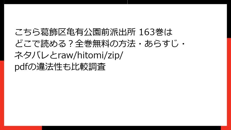 こんにちは、漫画好きの皆さん! 人気の長編漫画『こちら葛飾区亀有公園前派出所』(こち亀)をはじめ、数多くの作品が海賊版サイト(raw、hitomi、zip、pdf、漫画バンクなど)で違法に公開されているのを見かけることがありますよね。「無料で全巻読めるなんて魅力的!」と思う気持ちはわかりますが、実際にはこれらのサイトを利用するだけで、深刻なリスクが待ち受けています。この記事では、そんな海賊版サイトの危険性を、法的・セキュリティ・経済的な側面から詳しく解説します。2025年現在も、閉鎖と再開を繰り返すこれらのサイトが、ユーザー被害を増やしている状況を踏まえ、読み応えのある内容でお届けします。ネタバレではなく、リスクの「ネタバレ」ですよ! さっそく深掘りしていきましょう。