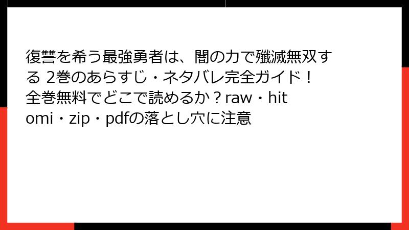 こんにちは、漫画愛好家の皆さん! ダークファンタジーの傑作『復讐を希う最強勇者は、闇の力で殲滅無双する』を、無料でサクッと読みたい気持ち、わかりますよ。主人公ラウルの壮絶な復讐劇にハマったら、続きが気になって仕方ないですよね。でも、raw、hitomi、zip、pdf、漫画バンクなどの海賊版サイトに手を出すのは、まるでラウルの闇の力に飲み込まれるような大惨事の始まりかも…。2025年現在、これらのサイトは法的・セキュリティ・経済的な地雷原です。実際、利用者の被害事例が急増中。この記事では、そんなリスクを多角的に深掘り。読み応え満点でお届けしますので、未読の方はここでブラウザを閉じて、正規ルートをおすすめします!