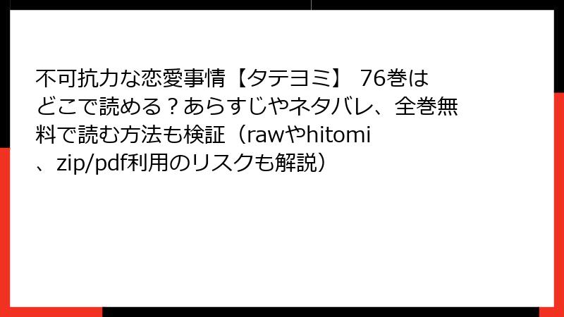 リスクを避けるなら、正規サービス一択! 『不可抗力な恋愛事情【タテヨミ】』は、公式アプリや電子書籍ストアで縦読み可能。初回無料エピソードや割引キャンペーンが多く、76巻も数分で購入できます。合法利用で高画質・広告なしの快適さを実感し、クリエイターを応援しましょう。