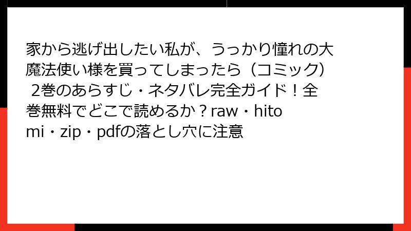 こんにちは、正規購入派ブロガーのミスティックです! 前回の2巻ネタバレが大好評の中、今回は超重要警告! 話題のファンタジーロマンス『家から逃出したい私が、うっかり憧れの大魔法使い様を買ってしまったら(コミック)』2巻を、raw/hitomi/zip/pdf/漫画バンクなどの海賊版サイトで読もうとしている皆さん、絶対にストップ! 無料の誘惑は魅力的ですが、リスクがデカすぎて後悔必至なんです。セキュリティから法的問題、作品の質まで、読み応え満点で徹底解説します。作者と出版社を応援しつつ、安全に楽しむための知識をお届け! 最後まで読んで、正規ルートを選ぼうぜ♪