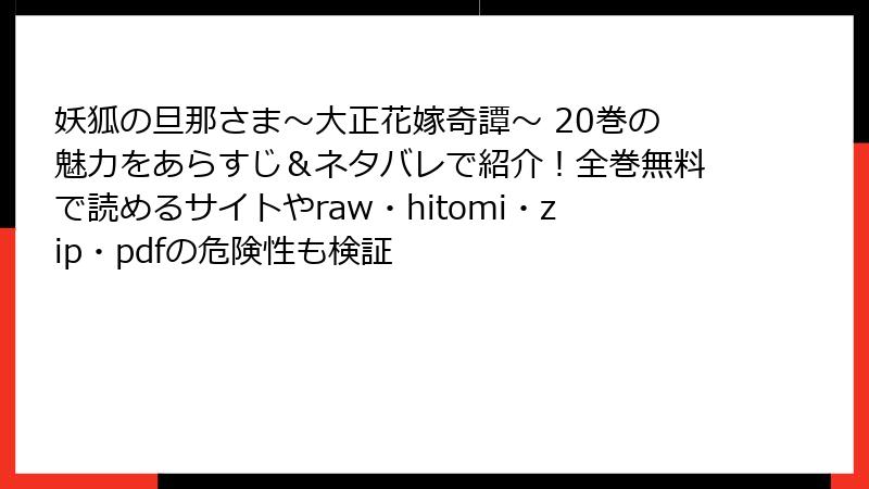 みなさん、こんにちは! 漫画大好きブロガーのあかりです。今回は、前回の20巻ネタバレに続き、超重要なお知らせ! 大好きな『妖狐の旦那さま~大正花嫁奇譚~』を、raw/hitomi/zip/pdf/漫画バンクなどの海賊版サイトで読もうとするあなたに、ガチのリスク大暴露をします。無料で読みたい気持ち、めっちゃわかります! でも、待って! この手のサイトは「甘い罠」の塊。ウイルス感染から法的制裁まで、人生を台無しにする危険がいっぱいなんです。読み応え満載で詳しく解説するので、絶対最後まで読んでくださいね。合法ルートで楽しむための参考に♪