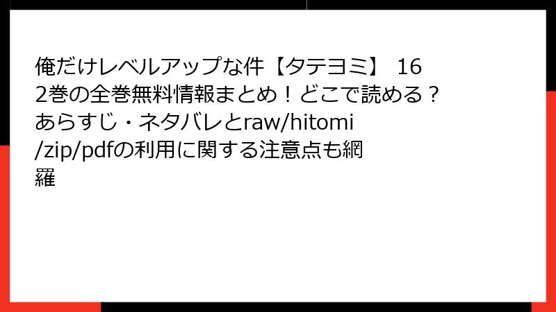 『俺だけレベルアップな件【タテヨミ】』の162巻は、アクションとドラマが融合したシリーズ屈指のエピソードです。ピッコマで連載中のこの韓国発ウェブトゥーンは、主人公・水篠旬の成長と壮絶なバトルで読者を魅了し続けています。今回は、162巻の詳細なネタバレをブログ形式で徹底解説! ダンジョンブレイクの恐怖、旬の圧倒的な戦闘力、そして物語の新たな伏線まで、すべて明らかにします。ネタバレ満載のため、未読の方はご注意ください。さっそく、物語の核心に迫っていきましょう!