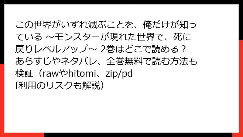 こんにちは、漫画好きのブロガーです! 人気の異世界ファンタジーやバトルアクション作品にハマると、ついつい無料で読みたい衝動に駆られますよね。特に、『この世界がいずれ滅ぶことを、俺だけが知っている ~モンスターが現れた世界で、死に戻りレベルアップ~』のような魅力的なコミックを、rawやhitomi、zip/pdf形式のダウンロード、漫画バンクなどの海賊版サイトで手に入れようとする人も少なくありません。でも、2025年現在、これらのサイトはただの「無料の罠」。法的トラブルからデバイス破壊、個人情報漏洩まで、深刻なリスクが潜んでいます。この記事では、そんな海賊版サイトの闇を、具体的な事例やデータに基づいて深掘り。読み応え満載で解説しますので、未読の作品を楽しむ前に、ぜひチェックしてください。あなたの安全な読書ライフを守るためのガイドです!