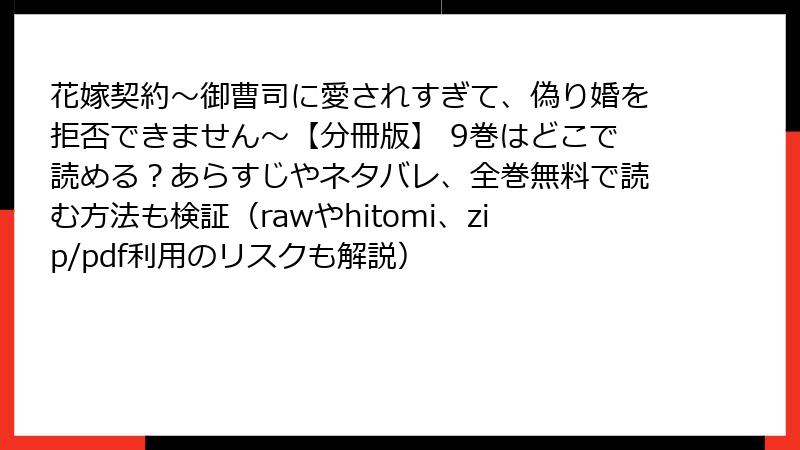 こんにちは、マンガ愛好家のあかりです! 今回取り上げるのは、大人気ラブロマンス漫画「花嫁契約~御曹司に愛されすぎて、偽り婚を拒否できません~【分冊版】」。この作品のドキドキ展開に夢中の方も多いはず! でも、raw、hitomi、zip、pdf、漫画バンクなどの海賊版サイトで読もうと考えているなら、ちょっと待って! これらのサイトを利用することは、思わぬリスクを伴います。この記事では、海賊版サイトで漫画を読むことの危険性を、法的、倫理的、技術的な視点から徹底解説します。読み応えのある内容で、