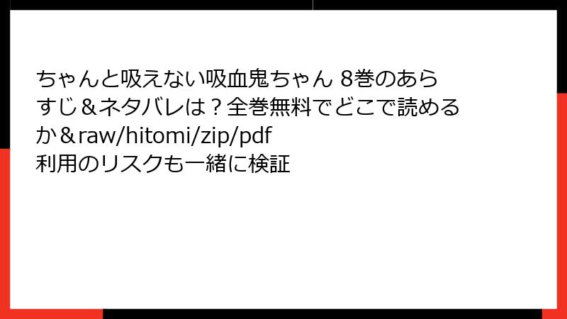 こんにちは! 『ちゃんと吸えない吸血鬼ちゃん』第8巻のファンなら、そのゆるくて癒されるストーリーを思う存分楽しみたいですよね。でも、raw、hitomi、zip、pdf、漫画バンクなどの海賊版サイトで漫画を読むことは、実は多くのリスクを伴います。この記事では、海賊版サイトを利用することの危険性を、法的、倫理的、技術的な観点から詳しく解説します。好きな作品を安全に楽しむために、ぜひ知っておいてください!