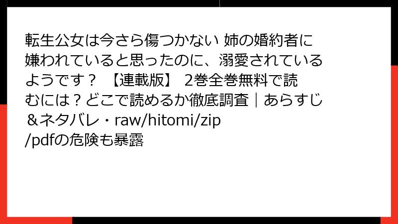 こんにちは、漫画好きの安全ネットユーザーです! 人気の転生ファンタジー『転生公女は今さら傷つかない 姉の婚約者に嫌われていると思ったのに、溺愛されているようです? 【連載版】』のような作品を無料で読みたい一心で、raw、hitomi、zip、pdf、漫画バンクなどの海賊版サイトに手を出したことはありませんか? 一見、最新巻を即ゲットできる魅力的な世界ですが、2025年現在、これらのサイトは法的・セキュリティの地雷原。利用者の被害事例が急増しており、軽い気持ちでアクセスすると、取り返しのつかない損害を被る可能性大です。このブログ記事では、そんな海賊版サイトのリスクを、法的側面からセキュリティ脅威、倫理的問題まで、複数のセクションで深掘り。事例や比較表も交えて、読み応え満載でお届けします。結論から言うと、絶対に避け、正規サービスで楽しむのが賢明! あなたのデバイスと心を守るための知識を、ぜひ身につけてください。