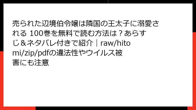 海賊版サイト(raw、hitomi、漫画バンクなど)は、著作権者の許可なく漫画やアニメを違法にアップロードし、無料で公開するウェブサイトやサービスです。これらのサイトは、表面上「無料で読める」と魅力的ですが、背後には多くの危険が潜んでいます。特に『売られた辺境伯令嬢は隣国の王太子に溺愛される』のような人気作品は、海賊版のターゲットになりやすく、違法アップロードが横行。以下、