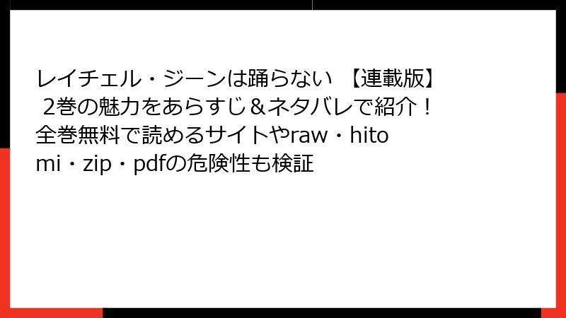 結局、海賊版サイトは「無料の罠」で、法・セキュリティ・プライバシー・倫理の4重苦。『レイチェル・ジーンは踊らない』2巻の誘拐劇みたいに、一瞬の油断で大ピンチ! 2025年10月現在、アクセス数は2億回超えだけど、被害報告も爆増中。皆さん、合法サイトで安全に読みましょう。次回はおすすめ正規サービスレビューしますね。コメントで体験談シェアして! 安全第一で漫画ライフを楽しんで♪