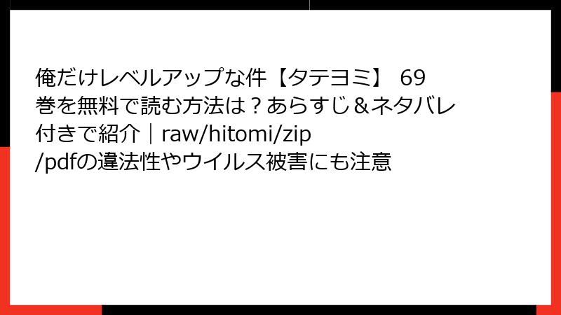 こんにちは、漫画愛好家のブロガーです! 人気ウェブトゥーン『俺だけレベルアップな件【タテヨミ】』の魅力にハマり、最新巻を無料で読みたい衝動に駆られたことはありませんか? 主人公・水篠旬の影の軍勢が大暴れする爽快バトルに夢中になるのは当然ですが、raw、hitomi、zip、pdf、漫画バンクなどの海賊版サイトに手を出すのは大間違い。2025年現在、これらのサイトは法的・セキュリティの爆弾だらけで、利用者の被害が急増中です。この記事では、そんなリスクを法的面から倫理的影響まで、多角的に深掘り。ブログ形式で読みやすくまとめました。一見の無料の誘惑に負けず、正規ルートで楽しむための警鐘としてお役立てください。ネタバレなしでリスク解説に徹しますよ!