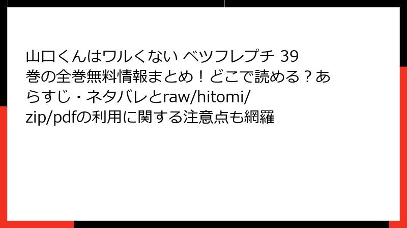 raw/hitomi/zip/pdf/漫画バンクなどの海賊版サイトは、法的罰則(懲役・罰金)、セキュリティ被害(感染・漏洩)、倫理的後悔の三重苦。2025年の今、取り締まり強化で「見るだけ」の甘えは通用しません。一時的な無料より、持続可能な楽しみを選んで。『山口くんはワルくない ベツフレプチ』のように、心温まる作品を支えるファンが増えれば、業界はもっと輝きます。皆さんの安全読書ライフを祈って! コメントで「私はこうして正規で読んでる」シェア待ってます♪ 次回もお楽しみに。