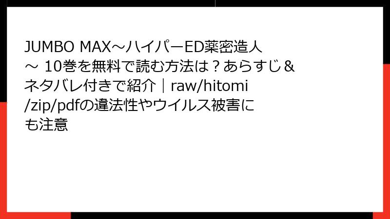 こんにちは、漫画ファンの皆さん! 前回は『JUMBO MAX~ハイパーED薬密造人~』のあらすじとネタバレを熱く語りましたが、今回はちょっと真剣モード。人気のこの作品を、rawやhitomi、zip、pdf、漫画バンクなどの海賊版サイトで「無料で読みたい!」と思う気持ち、わかります。でも、待ってください。その一時の快楽が、取り返しのつかない大惨事につながる可能性が満載なんです。法的トラブルからウイルス感染、個人情報漏洩まで、具体的なリスクを徹底的に掘り下げます。この記事を読めば、海賊版の闇がよーくわかりますよ。絶対に正規ルートをおすすめしますが、まずはその理由を読み応えたっぷりでお届け!