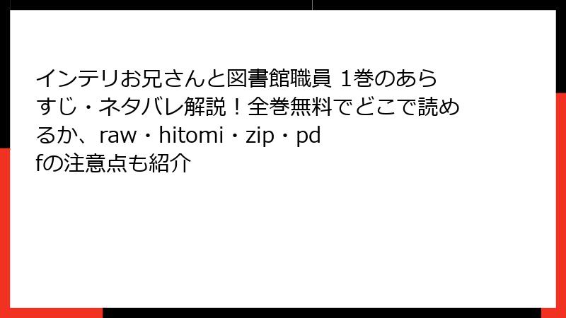 こんにちは、漫画愛好家の皆さん! 大好きな作品を無料で読みたい気持ち、痛いほどわかります。でも、raw、hitomi、zip、pdf、漫画バンクといった海賊版サイトを利用すると、想像以上のリスクが潜んでいるんです。今回は「インテリお兄さんと図書館職員」1巻を例に、法的・セキュリティ・倫理的観点から徹底解説。蓮見くんの純粋な笑顔を守るためにも、正しい読み方で応援しましょう!