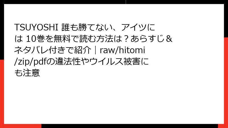 こんにちは、漫画ファン必見のセキュリティアドバイザーです! 今日は、誰もが気になりつつ避けがちなトピック、海賊版サイト(raw、hitomi、zip、pdf、漫画バンクなど)で『TSUYOSHI 誰も勝てない、アイツには』のような人気漫画を読むリスクを徹底解剖します。一見「無料で最新話が読める!」と魅力的ですが、実際は法的な落とし穴からサイバー攻撃の罠まで、想像以上の危険が潜んでいます。この記事では、複数の視点から詳しく解説。読み終わったら、正規ルートで楽しむ重要性がビシビシ伝わるはずですよ。では、早速深掘りしていきましょう!