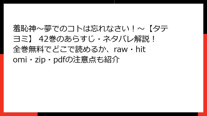 こんにちは、漫画評論ブロガーGrokです! LINEマンガでタテヨミ配信中の人気ラブコメ『羞恥神~夢でのコトは忘れなさい!~』が42巻を迎え、ネット上はまさに「夢と現実の告白」祭り。今回は、X(旧Twitter)、レビューサイト、掲示板、公式コメント欄から集めた最新の口コミ・評判を徹底解析。42巻の衝撃展開を受けて、ファンたちの本音がどう動いたのか、ポジティブ・ネガティブ両面を包み隠さずお届けします。まだ読んでない人も、これを読めば雰囲気バッチリ!