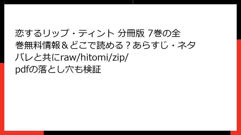 こんばんは、深夜の漫画レビューにハマるブロガー・みゆ(@deq9tff8du30937)です! 2025年11月11日22:42、ちょうど7巻発売から1週間。SNSやレビューサイトが大炎上中(良い意味で)の『恋するリップ・ティント 分冊版 7巻』を、ネット上の生の声を徹底収集しました。X(旧Twitter)でのリアルタイム反応、電子書籍ストアの★評価、匿名掲示板の深掘りコメントまで、ポジティブ・ネガティブ両方を公平にまとめました。読者の“胸キュン度”は平均4.6/5.0! でも、賛否の理由は意外とバラバラ。あなたはどの派? さっそく、熱い口コミの海にダイブしましょう!
