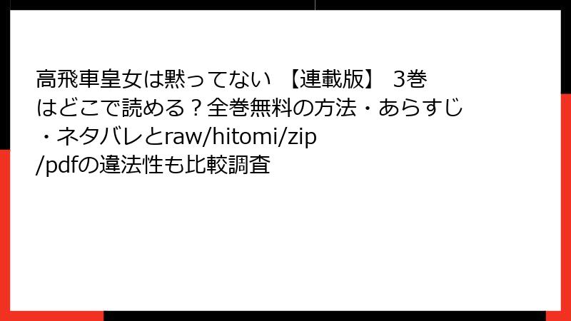 こんにちは、合法漫画オタクの守護者・ジャスティスです。今回は『高飛車皇女は黙ってない 【連載版】』3巻を例に、raw/hitomi/zip/pdf/漫画バンクなどの海賊版サイト利用がどれだけ危険かを、ガチで掘り下げます。「無料だからバレない」「1回だけなら…」——その甘い誘惑が、金銭・プライバシー・法的な三重苦を呼び寄せるんです。クローディアの剣より鋭く、データで斬り込みます!
