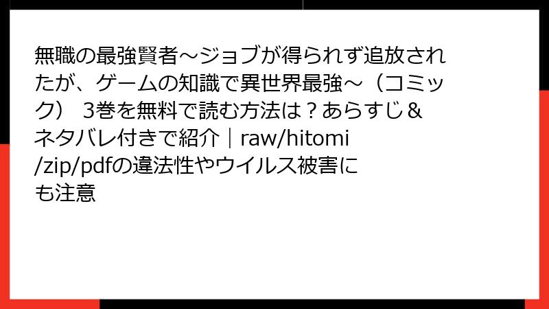 「最新巻が待ちきれなくて…」「無料ならいいよね?」――そんな甘い誘惑に負けて、**raw、hitomi、漫画バンク、zip、pdf**などの海賊版サイトに手を出す前に、**絶対に読んでおくべき現実**があります。『無職の最強賢者』3巻を例に、**「ただの無料漫画」じゃない、ガチの危険性**を、被害者の声とデータで徹底解剖。**「自分は大丈夫」**は通用しません。スマホが壊れる、個人情報がダダ漏れ、金銭的損失…全部、実例付きで晒します。