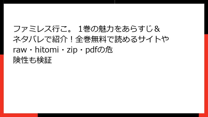 人気急上昇中の『ファミレス行こ。』。つい「無料で読みたい」衝動に駆られますが、raw、hitomi、漫画バンク、zip、pdf といった海賊版サイトには致命的なリスクが潜んでいます。ここでは、法的・技術的・倫理的観点から、2025年11月時点の最新情報に基づいて徹底解説します。読む前に一度立ち止まってください。