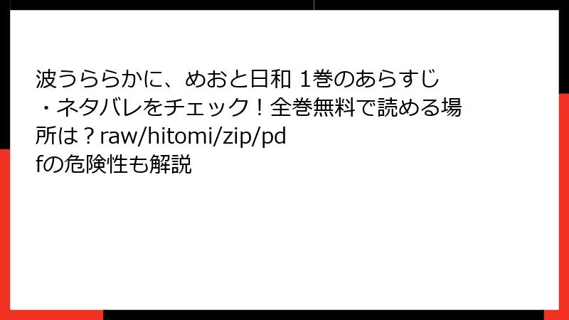 こんにちは、漫画愛好家のブロガーです。今日は、戦前の優しい夫婦物語『波うららかに、めおと日和』を「raw」「hitomi」「漫画バンク」「zip」「pdf」などの海賊版サイトで読むことの危険性を、徹底的に掘り下げます。無料で読める誘惑は強いですが、その裏には取り返しのつかないリスクが潜んでいます。2025年11月15日現在、違法アップロードはますます巧妙化していますが、被害者も増え続けています。この記事を読めば、「もう二度と海賊版には手を出さない」と誓いたくなるはず。あなたの大切なデバイスとプライバシーを守るために、ぜひ最後までお読みください!
