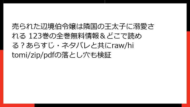 raw、hitomi、zip、pdf、漫画バンクなどの海賊版サイトで『売られた辺境伯令嬢は隣国の王太子に溺愛される』を読むのは、法的・セキュリティ・品質・倫理的なリスクが多すぎます。一時の無料に惑わされず、公式アプリや書店で楽しむのが賢明。あなたの安全と業界の未来を守る選択を!