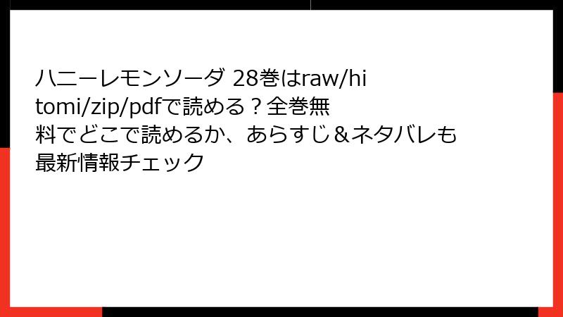 『ハニーレモンソーダ』は、挙げた全8サービスで電子書籍として充実配信中。無料試し読みから始めれば、すぐに界くんと羽花の世界に没入できます。最新28巻の衝撃展開を、いつでもポケットから取り出して楽しむ時代。公式配信を選んで、作者を応援しつつ、心揺さぶるラブストーリーを満喫しましょう! 次はあなたのお気に入りサービスはどれ?