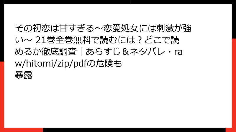 人気ラブコメ漫画『その初恋は甘すぎる~恋愛処女には刺激が強い~』を楽しみたいけど、海賊版サイト(raw、hitomi、zip、pdf、漫画バンクなど)で無料で読むのは危険がいっぱい! 手軽に見えるけど、法的・セキュリティ的な落とし穴が潜んでいます。この記事では、そんなリスクを詳しく掘り下げ、なぜ避けるべきかをブログ風に解説。合法的に楽しむヒントも交えつつ、注意喚起をメインに進めます。まだ海賊版に手を出していない人は、ぜひ参考に!