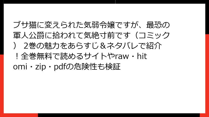 - 『ブサ猫に変えられた気弱令嬢ですが、最恐の軍人公爵に拾われて気絶寸前です』を海賊版(raw・hitomi・漫画バンク・zip・pdfなど)で読むと、本当にヤバい理由を全部教えます