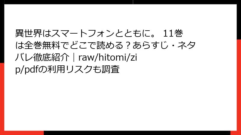 人気の異世界ファンタジー作品『異世界はスマートフォンとともに。』の第11巻を、raw、hitomi、zip、pdf、漫画バンクなどの海賊版サイトで無料で読もうと考える人もいるかもしれません。しかし、これらのサイトを利用することは、さまざまな深刻なリスクを伴います。この記事では、海賊版サイトの利用がもたらす法的、セキュリティ、プライバシー、品質、倫理的側面のリスクを詳しく解説します。海賊版は一見お得に見えますが、結果として自分自身や社会に大きな損害を与える可能性が高いのです。以下で、各リスクを深掘りしていきましょう。