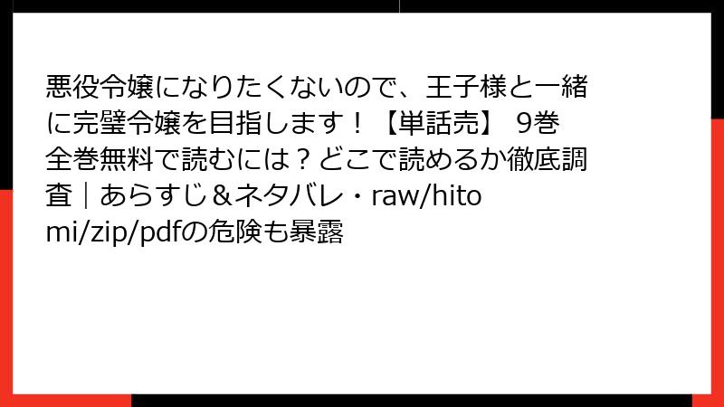 こんにちは、漫画ファンとして正規ルートを推奨するブロガーです。人気の悪役令嬢もの「悪役令嬢になりたくないので、王子様と一緒に完璧令嬢を目指します!」は、魅力的なストーリーで多くの読者を魅了しています。しかし、海賊版サイト(raw、hitomi、zip、pdf、漫画バンクなど)で無料で読もうとする人が後を絶ちません。今回は、そんな海賊版利用のリスクを詳しく掘り下げます。法的・セキュリティ面から倫理的側面まで、ブログ形式で解説。海賊版の甘い誘惑に負けないための知識を身につけましょう!