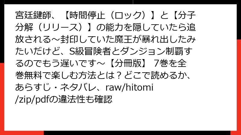宮廷鍵師、【時間停止(ロック)】と【分子分解(リリース)】の能力を隠していたら追放される~封印していた魔王が暴れ出したみたいだけど、S級冒険者とダンジョン制覇するのでもう遅いです~【分冊版】 7巻を全巻無料で楽しむ方法とは?どこで読めるか、あらすじ・ネタバレ、raw/hitomi/zip/pdfの違法性も確認
