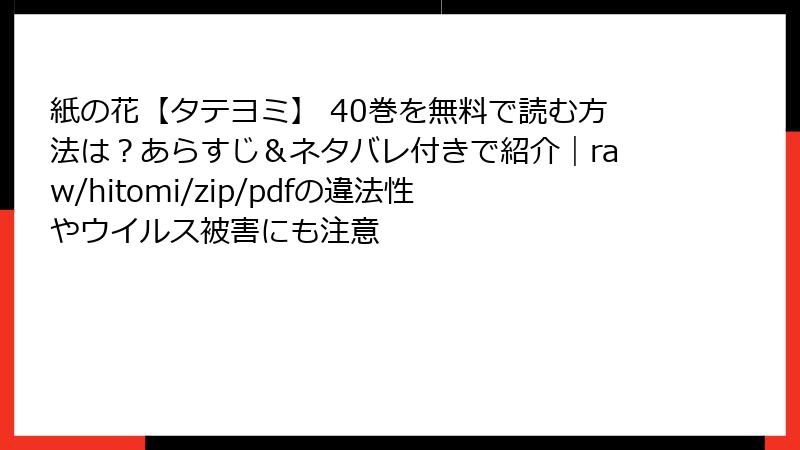 大好きな『紙の花』を海賊版(raw、nhentai、hitomi、漫画バンク、manga raw、センセーショナルなzip・pdf配布サイトなど)で読むと、あなた自身が本当にヤバい目に遭う確率が異常なまでに高いんです。
