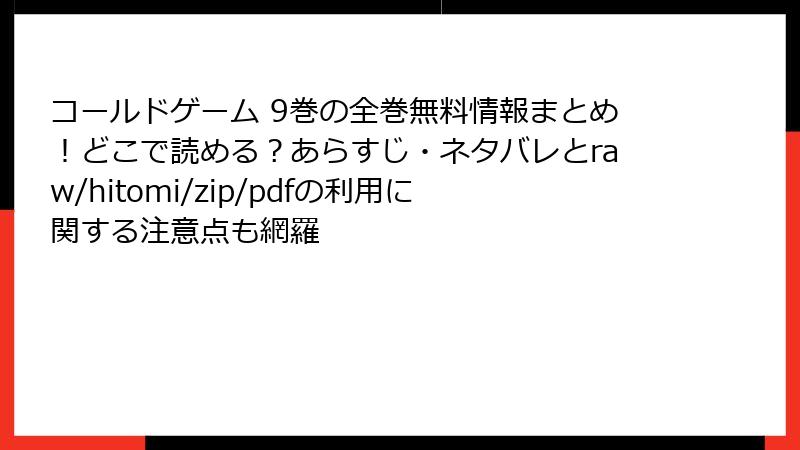 raw、hitomi、zip、pdf、漫画バンクなどの海賊版サイトで『コールドゲーム』9巻を読むのは、法的・セキュリティ・プライバシー・品質の多角的なリスクを伴います。これらを無視すれば、罰金、デバイス破壊、情報漏洩といった深刻な被害に直面するかも。海賊版の蔓延は、マンガ業界の未来を脅かします。リスクを理解し、賢明な選択を心がけましょう。結局、安物買いの銭失いにならないよう、注意が必要です。