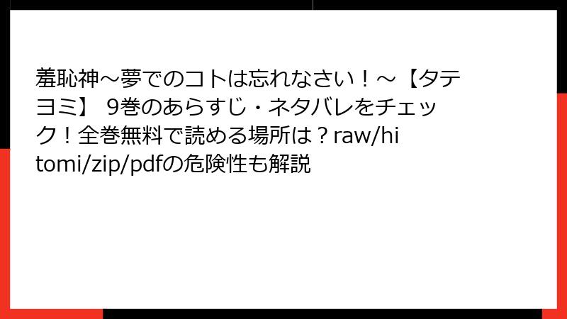 みなさん、こんにちは! 漫画オタクのブロガー、マンガマニアです。今回は、リクエストにお応えして『羞恥神~夢でのコトは忘れなさい!~【タテヨミ】』の9巻を、ガチのネタバレ満載で深掘りします。未読の方はここでブラウザバック推奨! この巻は、夢の試練がエスカレートし、新ヒロインの登場でハーレム要素が本格化する転機。ドキドキの羞恥シーンと心の揺らぎが交錯する、シリーズ屈指のエモい一冊ですよ。フルカラータテヨミの魅力も相まって、読み終えた後の余韻がすごいんです。さあ、ネタバレの渦へ飛び込みましょう!