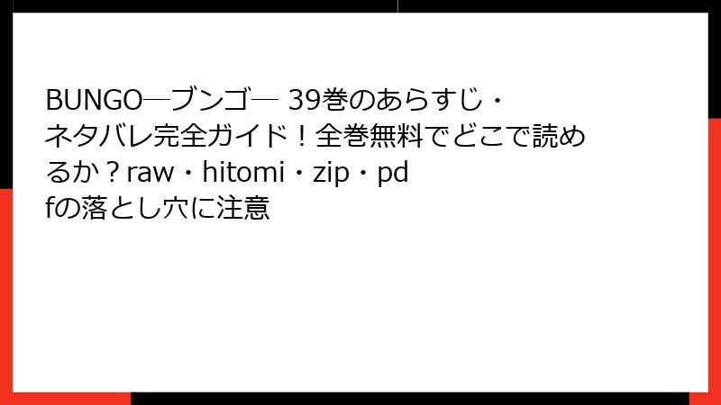 raw、hitomi、zip、pdf、漫画バンクなどの海賊版サイトで『BUNGO―ブンゴ―』を読むことは、法的罰則、セキュリティ被害、プライバシー漏洩、品質低下、倫理的問題という多大なリスクを伴います。これらを回避するためには、公式の電子書籍サービスや書店を利用するのがベストです。無料の誘惑に負けず、長期的に見て自分を守る選択をしてください。安全第一で、素晴らしい漫画の世界を楽しみましょう。