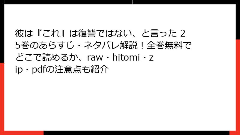 復讐サスペンスの傑作として人気を博す『彼は『これ』は復讐ではない、と言った』。25巻では、物語がさらに加速し、過去のいじめ加害者たちに対する「仇討ち」の渦が頂点に達します。高校時代に主人公・小嶋龍吉の人生を破壊した6人の加害者たちが、社会人として平穏を装う中、謎の覆面人物による冷徹な制裁が次々と繰り広げられます。この巻は、心理描写の深さと予測不能な展開が光り、読者を息もつかせぬ緊張感に引き込みます。以下では、ネタバレ満載の詳細あらすじを、主要なシーンごとに分けながら解説。復讐の連鎖がもたらす人間の闇を、じっくりと味わってみてください。
