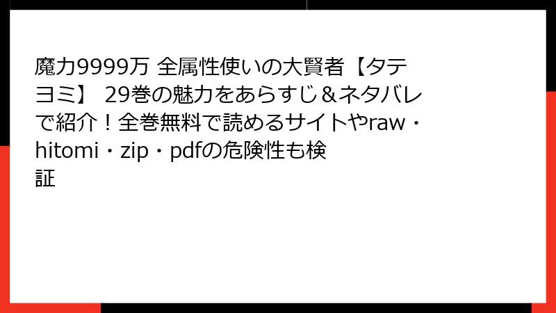 こんにちは、マンガファンで著作権意識の高いブロガーです。今日は、人気ウェブトゥーン「魔力9999万 全属性使いの大賢者【タテヨミ】」を、raw、hitomi、zip、pdf、漫画バンクなどの海賊版サイトで読むことのリスクについて、ガチで深掘りします。この作品は正規ルートで楽しむのがベストですが、海賊版の誘惑に負けそうになる人もいるはず。でも、待って! そんな行為には想像以上の落とし穴が潜んでいます。法的・セキュリティ・倫理的な側面から、ネタバレなしで詳しく解説。読み応えを出すためにセクション分けして、箇条書きやテーブルも活用しますよ。参考にどうぞ。