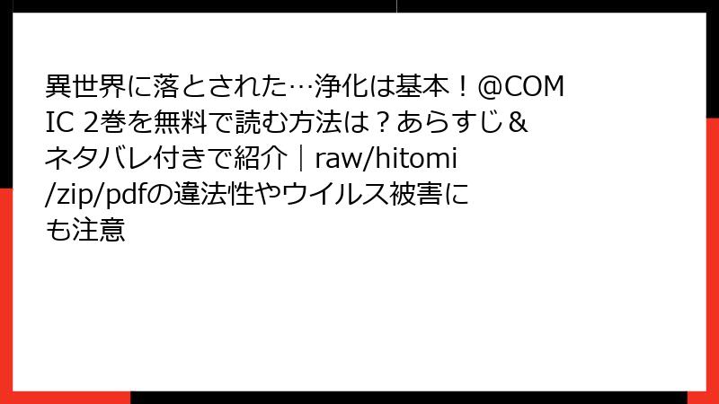 異世界転生漫画の人気作「異世界に落とされた…浄化は基本!@COMIC」を、無料で手軽に楽しみたいと思う人は少なくないでしょう。しかし、raw、hitomi、zip、pdf、漫画バンクなどの海賊版サイトを利用するのは、さまざまな危険を伴います。これらのサイトは著作権を無視した違法アップロードが主流で、利用者が知らずにトラブルに巻き込まれるケースが増えています。本記事では、法的・セキュリティ・品質・倫理的側面からリスクを詳しく解説。公式ルートでの購入やサブスクリプションを強くおすすめします。