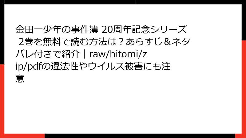 raw、hitomi、zip、pdf、漫画バンクなどの海賊版サイトで『金田一少年の事件簿 20周年記念シリーズ 2巻』を読むのは、法的・セキュリティ・プライバシー面で多大なリスクを伴います。