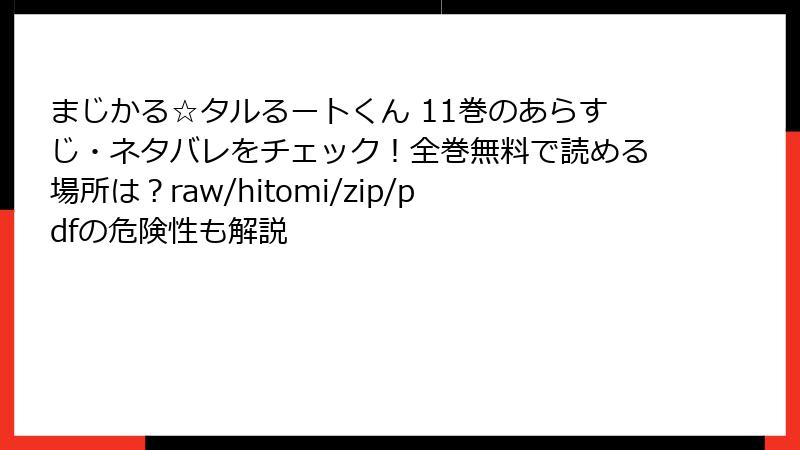 人気のギャグ漫画「まじかる☆タルるートくん」を楽しみたいと思っている方の中には、raw、hitomi、zip、pdf、漫画バンクなどの海賊版サイトを利用しようと考える人もいるかもしれません。しかし、これらのサイトは違法アップロードされたコンテンツを提供しており、利用には深刻なリスクが伴います。この記事では、そうした海賊版サイトで漫画を読むことの危険性を詳しく解説します。法的問題からセキュリティの脅威まで、さまざまな側面から考察し、なぜ避けるべきかを明らかにします。