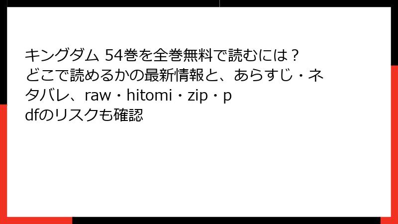 キングダムは人気の歴史漫画ですが、海賊版サイト(raw、hitomi、zip、pdf、漫画バンクなど)で無料で読もうとする行為には、さまざまなリスクが伴います。これらのサイトは著作権を侵害した違法コンテンツを扱っており、利用者は知らず知らずのうちにトラブルに巻き込まれる可能性があります。この記事では、そんな海賊版サイトの利用リスクを法的、セキュリティ、経済的・倫理的観点から詳しく解説します。安全に楽しむための意識を高めましょう。