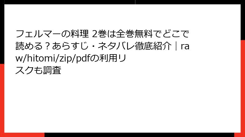 『フェルマーの料理』をrawやhitomiなどで読むのは、法的・セキュリティ・プライバシーの観点から極めて危険です。ブログとして強くおすすめするのは、正規の電子書籍サービスを利用すること。リスクを避け、作者を応援する形で漫画を楽しめば、心から満足できるはずです。あなたはどう思われますか? コメントでシェアを!