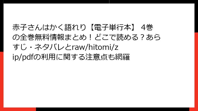 こんにちは、漫画ファン歴20年のブロガーです。今日は、人気育児コミック『赤子さんはかく語れり』を、raw、hitomi、zip、pdf、漫画バンクなどの海賊版サイトで読むことのリスクについて、詳しくお話しします。この作品は可愛い赤ちゃんの名古屋弁心の声が魅力ですが、海賊版で楽しもうとすると、思わぬ落とし穴が待っています。法的問題からセキュリティの脅威まで、読み応えのある内容でまとめました。海賊版の利用はおすすめしませんよ!