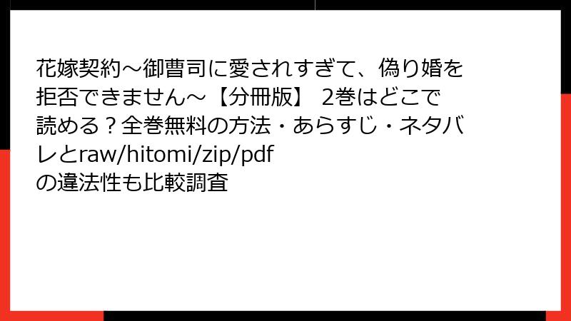以上のように、「花嫁契約~御曹司に愛されすぎて、偽り婚を拒否できません~」を海賊版サイトで読むのは、法的・セキュリティ・品質・倫理的なリスクが満載です。これらを避けるためには、正規のプラットフォームを利用することをおすすめします。無料で楽しむ方法も探せばありますが、海賊版の誘惑に負けず、作者を応援する選択を。あなたのマンガライフがより豊かになるはずです! コメントであなたの体験談をお待ちしています。