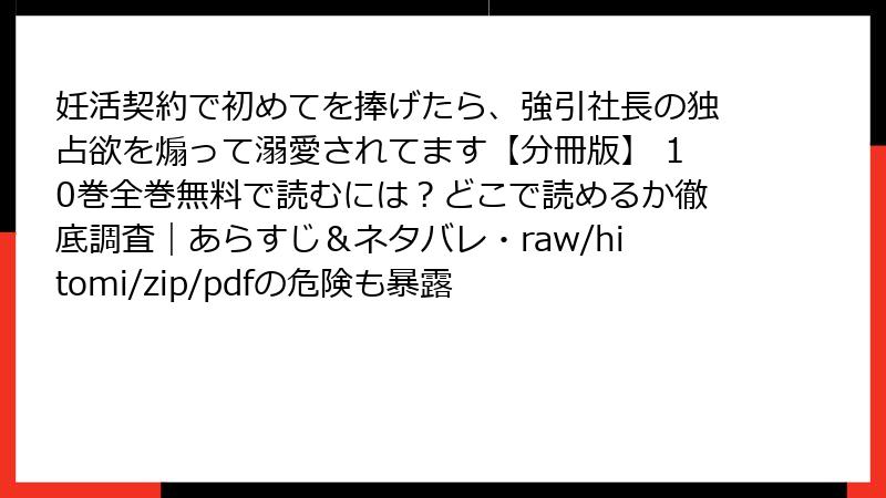 こんにちは、漫画の著作権問題に詳しいブロガーです。人気のロマンス漫画「妊活契約で初めてを捧げたら、強引社長の独占欲を煽って溺愛されてます【分冊版】10巻」を、raw、hitomi、zip、pdf、漫画バンクなどの海賊版サイトで読むのは一見手軽ですが、実は深刻なリスクが伴います。この記事では、そんな海賊版利用の危険性を多角的に深掘り。法的側面からセキュリティ、倫理的問題まで、読み応えのある内容でお届けします。公式ルートで楽しむ大切さを再認識しましょう!