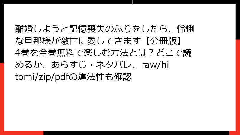 こんにちは、漫画ファン歴10年以上のブロガーです。今日は、人気ラブコメ「離婚しようと記憶喪失のふりをしたら、怜悧な旦那様が激甘に愛してきます【分冊版】4巻」を、raw、hitomi、zip、pdf、漫画バンクなどの海賊版サイトで読むことのリスクについて、詳しくお話しします。無料で手軽に読めそうに思えますが、実は大きな落とし穴がいっぱい。法的問題からセキュリティの脅威まで、未然に防ぐための知識として参考にしてくださいね。決して推奨するものではなく、警告のための記事です。