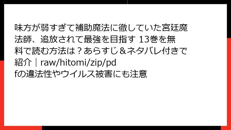 人気のファンタジー漫画『味方が弱すぎて補助魔法に徹していた宮廷魔法師、追放されて最強を目指す』を、raw、hitomi、zip、pdf、漫画バンクなどの海賊版サイトで読むのは一見手軽ですが、実はさまざまな危険が潜んでいます。この記事では、そんな海賊版サイト利用のリスクを詳しく解説。法的問題からセキュリティの脅威まで、知っておくべきポイントを深掘りします。海賊版はクリエイターの権利を侵害する行為ですが、ここでは利用者が直面する現実的なリスクに焦点を当てます。興味のある方は、ぜひ最後までお読みください。